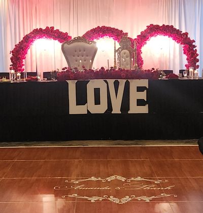 Silver: 2 hour rental. Heart shaped arch w/ red or white florals. Neon Sign (options available). Red or white carpet. Cylinder Vases w/ candles. Red or white Rose Petals. 6 floral centerpieces. Starting at $850